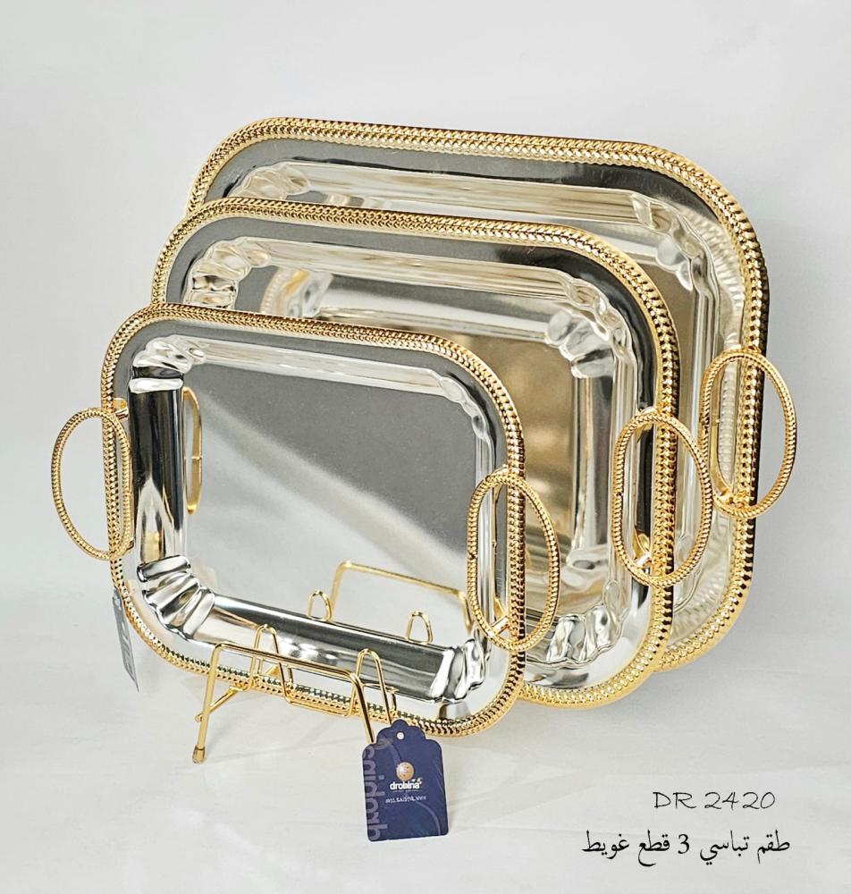 أضف لمسة من الأناقة والفخامة إلى مناسباتك مع طقم تباسي التقديم الفضي بالذهبي المكون من 3 قطع. بتصميمه الراقي ولمعانه الساحر، يجمع هذا الطقم بين الجمال العملي والتفاصيل المذهلة ليكون الاختيار المثالي لتقديم الشاي والقهوة والحلويات، المكسرات، والضيافة الفاخرة.